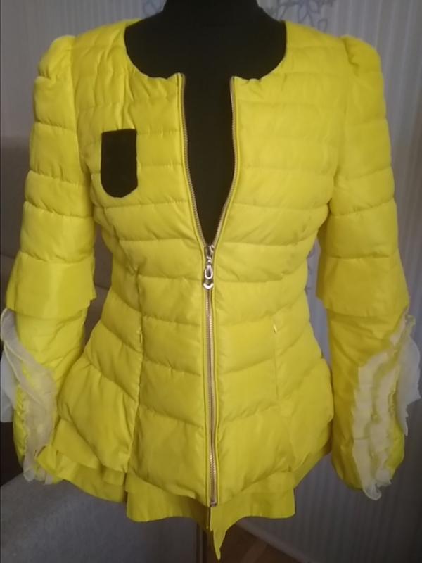 яскрава підліткова курточка дуже стильна, з надзвичайно гарним оздобленням на рукавах у вигляді рози і замочком спереду. Крій до низу розкльошений з оборками.Дуже легенька і зручна. Довжина по спині- 65 см., довжина рукава - 65 см., ширина по спині - 45 см.Спереду є дві потайні кишені на замочку..
