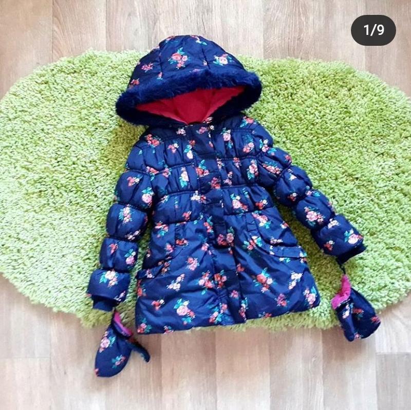 Деми куртка с варежками фирмы George, размер указан 4-5 лет,на рост 104-110 см. Состояние идеальное,без нюансов. Снаружи водоотталкивающая ткань,внутри на синтепоне и флисе. Сезон:холодная осень-еврозима. Варежки отстегиваются. Замеры: Длина от плеча до низа 50 см Ширина под ручками 33 см плюс резиночки отлично тянутся Рукав от плеча 35 см плюс манжет Плечи 30 см