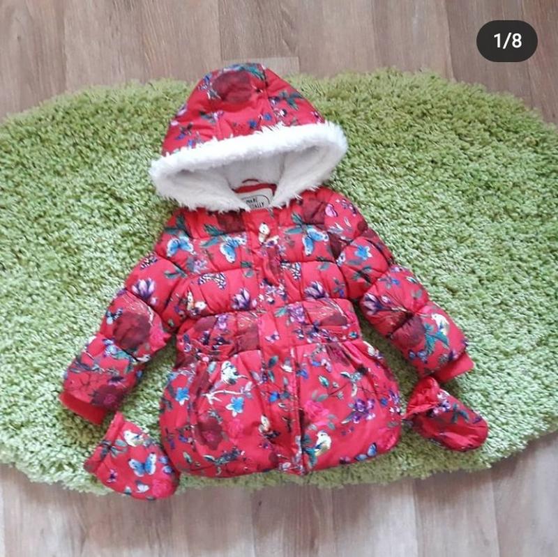 Яркая теплая курточка с варежками. Фирма M&S. Размер 12-18 месяцев на рост 86 см, но будет дольше. Снаружи водоотталкивающая ткань, внутри на синтепоне и плюшевой подкладке. Состояние идеальное. Застёгивается высоко под шею, есть манжеты на рукавах. Замеры: Длина от плеча до низа 43 см Ширина под ручками 31 см плюс резиночки тянутся. Рукав от плеча 31 см Плечи 25 см