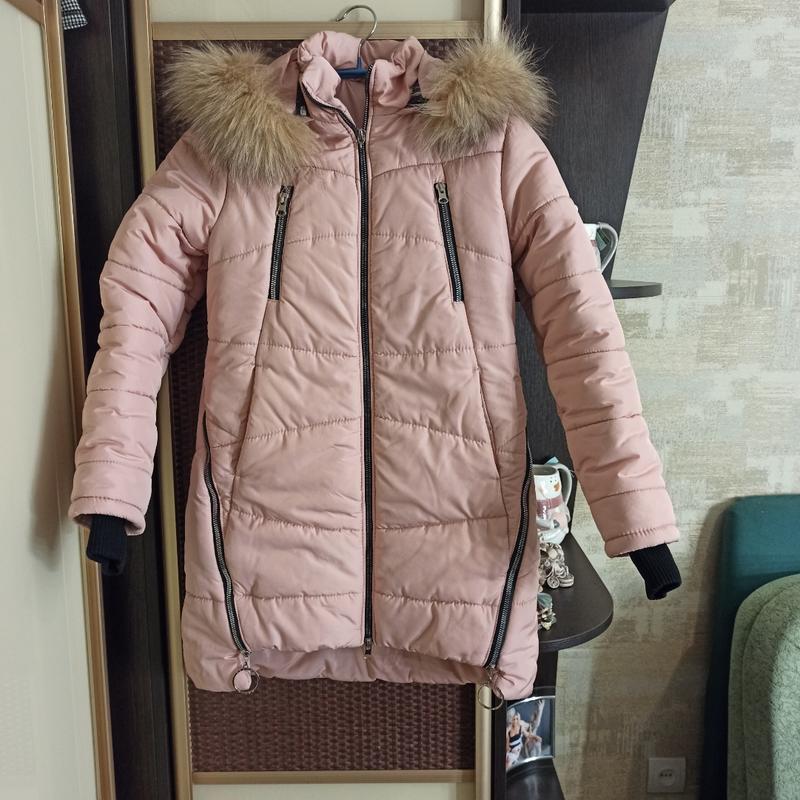 Продам теплу подовжену куртку з капюшоном, б/у в дуже хорошому стані, на худеньку дівчинку, 10-11 років. Капюшон знімається, хутро штучне, рукав манжет-резинка.. Змійки всі робочі, на одній собачці немає колечка, на фото видно. Довжина по спинці-76 Плечі-36 Груди-43 Талія-42 Низ-47 Рукав з манжетом-56