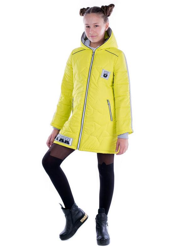 Демісезонна куртка для дівчаток "Зірка". Основна тканина - плащівка (канада). Підкладкова тканина - нейлон. Оздоблення - трикотаж (двунітка). Утеплювач - силіконізований синтепон. Капюшон не відстібається. У виробі два функціонуючих кишені. По середній частині капюшона та рукавах присутні три смуги з тасьми (двунітка). Внизу рукавів внутрішні манжети з трикотажної тканини. Кольори: Яблуко -40(ріст 152см),44(зріст 164см) Лимон - 34(зростання 134см),40(ріст 152см),42(ріст-158см),44(зріст 164см)
