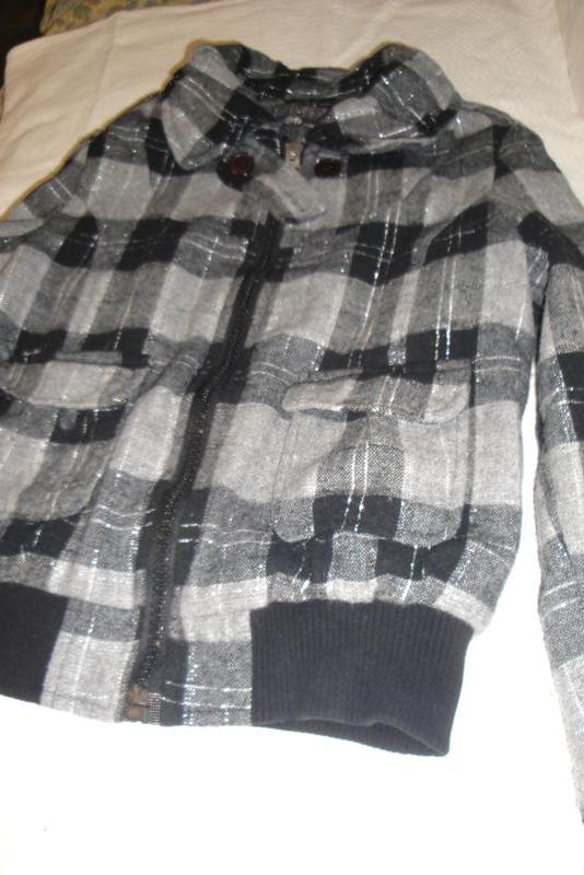 Весенняя тканевая куртка р. 36 длина 55 см, ширина под проймой 50 см, ширина внизу по резинке 35 - 41 см, длина рукава от ворота 72 см, от проймы 60 см. Цвет серый с черным, по ткани проходит тонкая нить серебристая.
