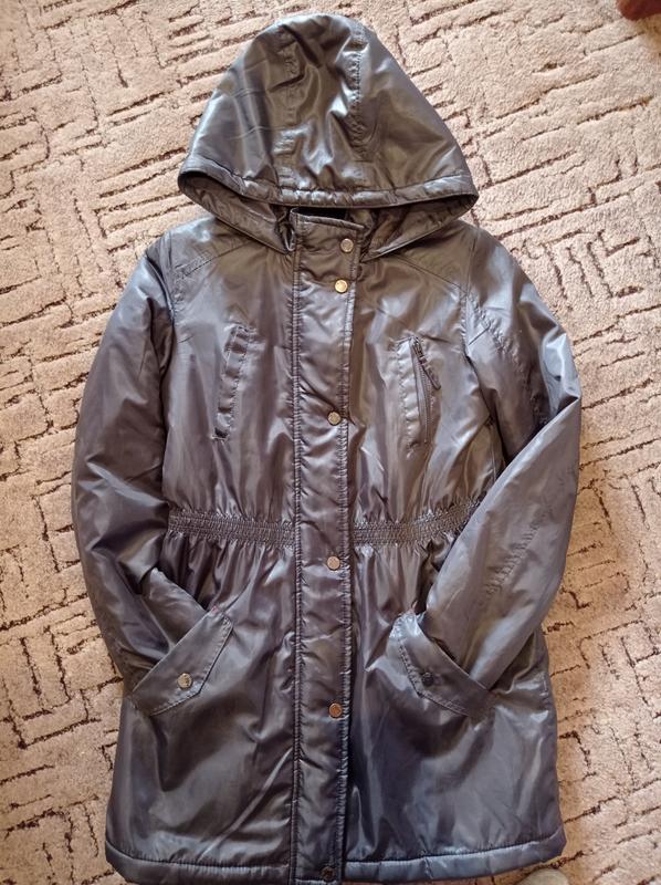 Лёгкая удлинённая куртка с капюшоном,талия на резинке, утеплена синтепоном, указан размер 164, возможно и на рост 158.