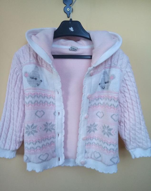 Кофта на флисовой подкладке Размер указан 18-24месяцв, будет и на более старше ребенка Верх вязаный (100% хлопок), подкладка-флис Плечи 30 ПОГ 34 Рукав 31.5 Длина 37.5
