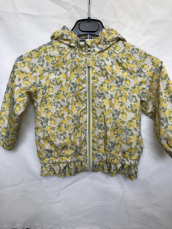 Легкая курточка - ветровка на девочку ростом 92 см. В очень хорошем состоянии, на хлопковой подкладки с карманами и капюшоном. Низ курточки на резинке с оборкой . Расцветка в лимоны , яркая и красивая. В живую расцветка ярче чем на фото.