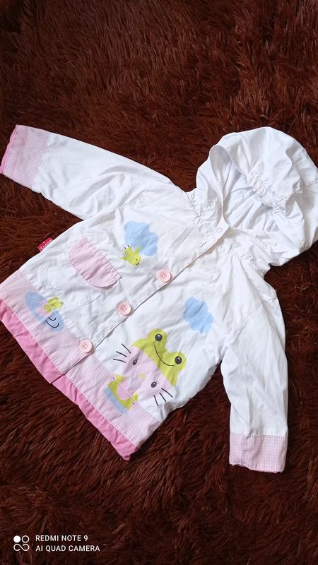 Лёгкая куртка ветровка для маленькой принцессы.Размер по бирке 12 месяцев.Дополнительный замеры вышлю.Из недостатков-нет верхней пуговицы.