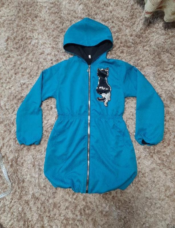 🐈Класнюча дитяча вітровка для дівчинки 🦄 Котик зроблений з паєток, дуже красиво))) Легка курточка з підкладом та капюшоном, по боках кишені. Розмір XXL(дивіться заміри,приблизний вік 8-12років) Заміри: Ширина плечей - 38,5 см П. Об'єм грудей - 45см П. Об'єм талії - 35см П. об'єм стегон - 50 см Довжина виробу - 74,5 см Довжина рукава - 52,5 см