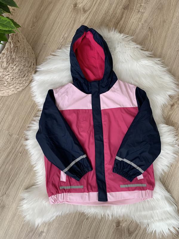 Нова куртка-дощовик, зверху прорезинена, всередині утеплена флісом (крім рукавів). Має світловідбивачі та кишені. На зріст 116/122 (5-7 років)