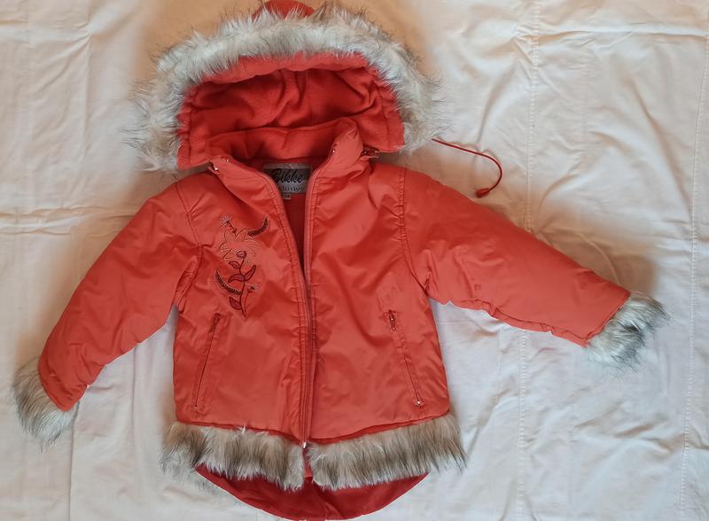 Куртка зимова на синтепоні + флісова підкладка. Капюшон і комір теж з флісом. Рукава без флісу. Верхня тканина як плащівка, не промокає. Спереду і ззаду вишивка. Колір яскраво оранжевий. Капюшон знімається. В ідеальному стані. Довжина спереду 45см, зад 54см Ширина 40см Плечі 33см Рукав від плеча 39см, від горла 48см Висота коміра 6,5см