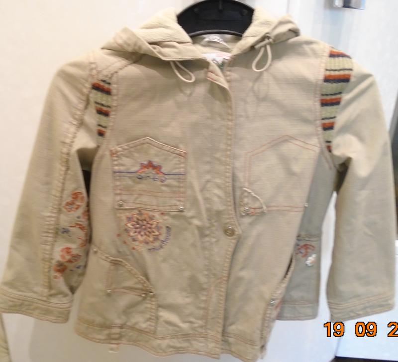 замечательная курточка на осень для девочки , на флисе, длина рукава 42 см., длина от плеча до низа 50 см. с капюшеном, в отличном состоянии, на замке молнии и кнопках