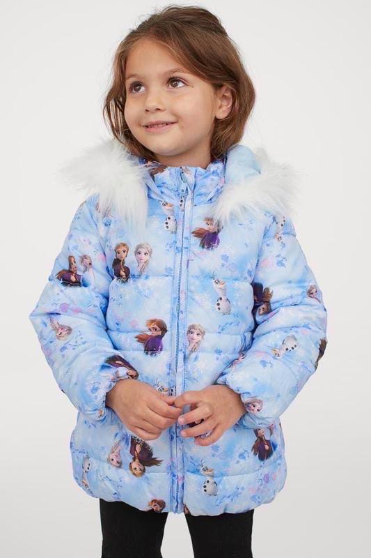 Утепленная куртка с набивным рисунком с воротником стойкой на флисовой подкладке и съемным капюшоном с оторочкой искусственным мехом. Потайная молния спереди с защитой подбородка, регулируемая талия на резинке, незаметные боковые карманы и узкая резинка внизу рукава и по низу куртки. Подкладка. (Описание с сайта) H&M 9-10 (4) Длина 63. ПОГ 42. Рукав 51