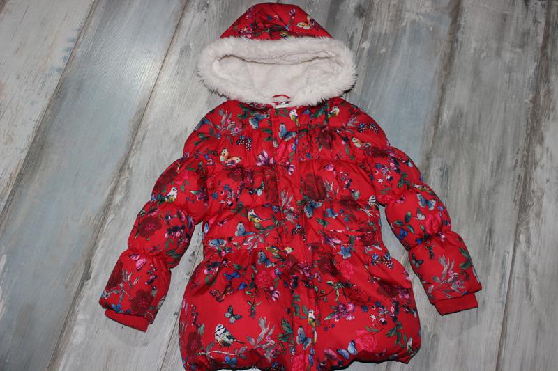 Шикарная яркая зимняя курточка фирмы M&S. Размер 3-4 года,на рост 104 см. Сезон:зима-холодная осень. Снаружи водоотталкивающая ткань, внутри на синтепоне и мягкой плюшевой подкладке. Состояние отличное,без нюансов,насыщенный цвет,наполнитель не сбит,манжеты отличные. Удлиненная как пальто,прикрывает попу. Очень рекомендую!У нас такая,мы довольны! Замеры: Длина от плеча до низа 52 Ширина под ручками 36 Рукав от плеча 38 плюс манжет Плечи 29