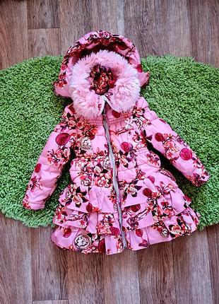 Очень классная качественная зимняя удлиненная курточка для девочки 104 см. На худенькую девочку! Куртка не широкая! Состояние идеальное. Высоко застёгивается под шею и можно даже завернуть воротник, шарф к ней точно не нужен. Мех снимается, капюшон отстёгивается тоже. Снаружи водоотталкивающая ткань, внутри на синтепоне и флисе. Замеры: длина от плеча до низа 54 ширина под ручками 32 Рукав от плеча 37