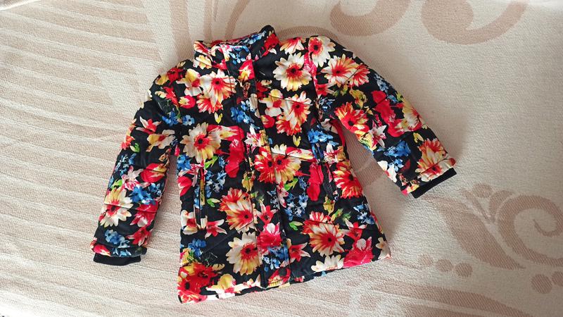 Очень красивая курточка для девчули. Есть затяжечки, но на такой расцветке не заметно. Нет капюшона, если найду отправлю покупателю. Замеры: длина 45 см, пог 34 см, рукав 35 см.