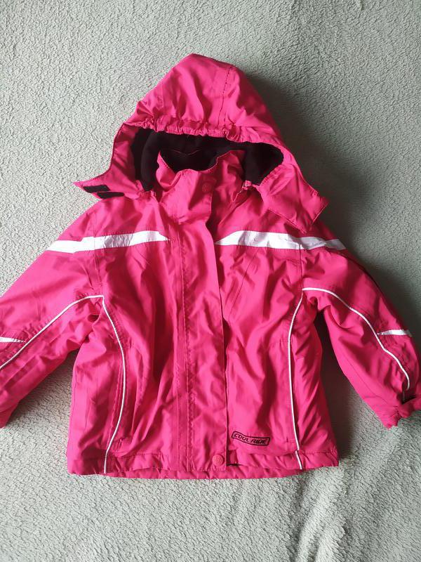 Зимова термо куртка для дівчинки Капюшон відстібається,є світловідбиваючі елементи.Замок,ліпучки функціонують добре, Нюанс є на фото 4(нижня кнопка не застібається) Довжина 43см Рукав 35см Ширина під руками 42см,ширина знизу 40см