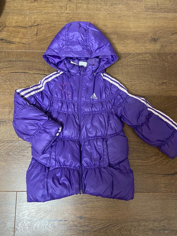 Курточка на девочку Adidas оригинал. Минимальные следы носки. Возраст указан 5-6 лет, мы носили с 4. Длина 51, ширина 36, рукав от капюшона 46
