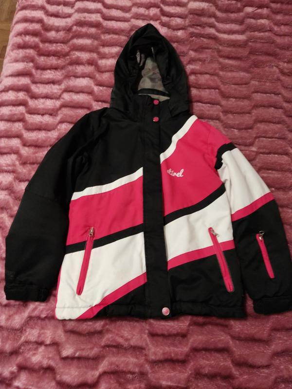 Красивая лыжная куртка для подростка. Имеет множество карманов и капюшон на кнопках. Из недостатков имеет зацепки и несколько пятнышек которые должны легко отстираться. ПО груди 44 см Длина изделия 54 см Длина рукава 50 см