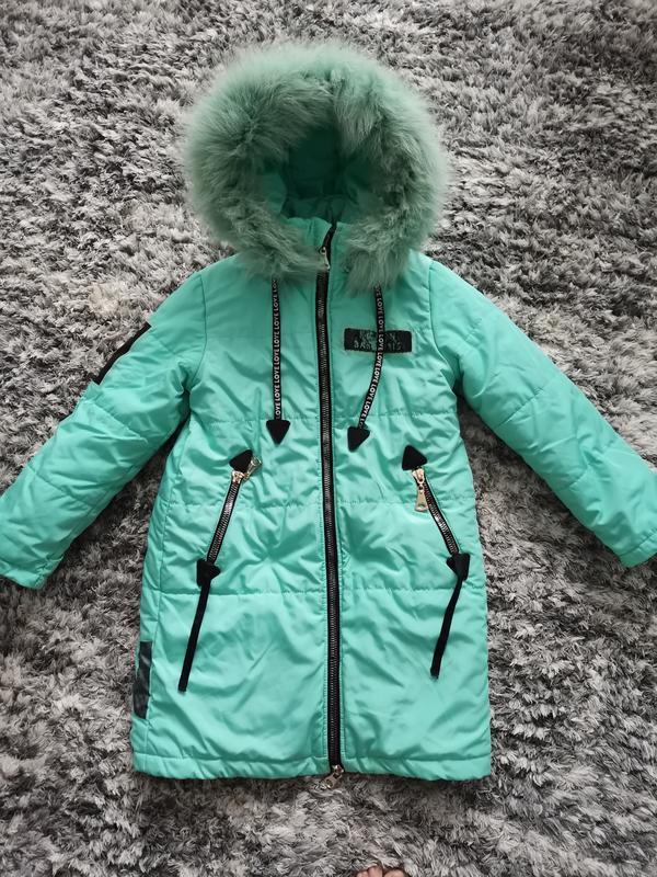 Мятное пальто для девочки, очень тёплое и красивое. Состояние в целом очень хорошее, но сзади немного выстирались буквы и внизу в средине разошлась подкладка, при желании легко подшить. Спинка и перед до половины утеплены флисовой подкладкой.