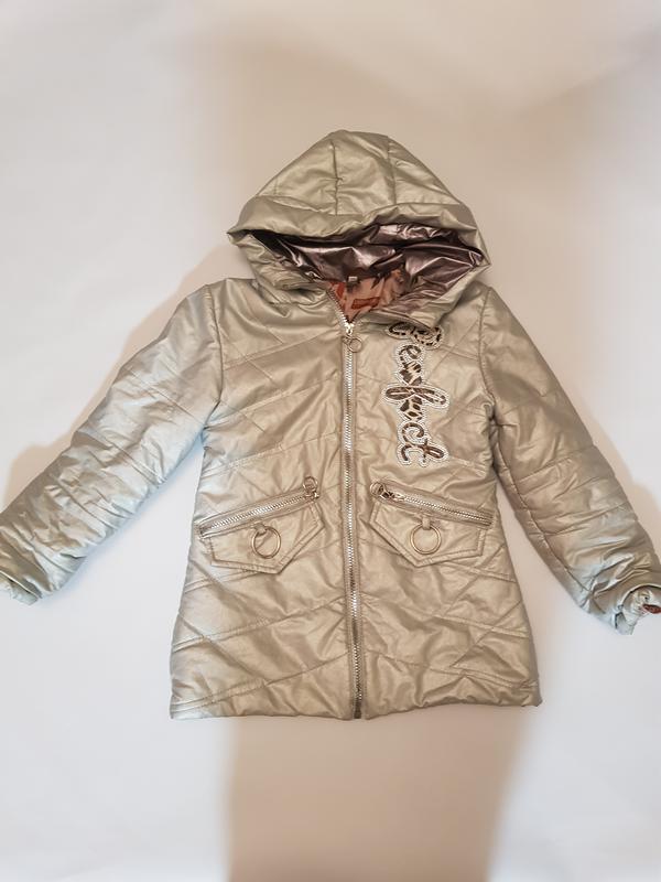 Куртка виконана з замінника сріблястого кольору, всередині тоненький синтепон, сезон: весна, осінь. Річ у гарному стані. Розійшлась по шву підкладка, див. фото, блискітки справні. Всі мірки на фото