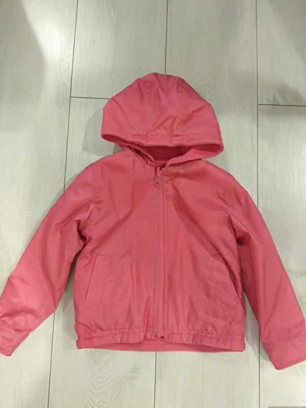 Носили с 2 до 3 лет, можно раньше. Рукава можно подвернуть. Куртка двусторонняя. С двух сторон карманы. С одной стороны не промокает. На рукаве есть пятнышко.