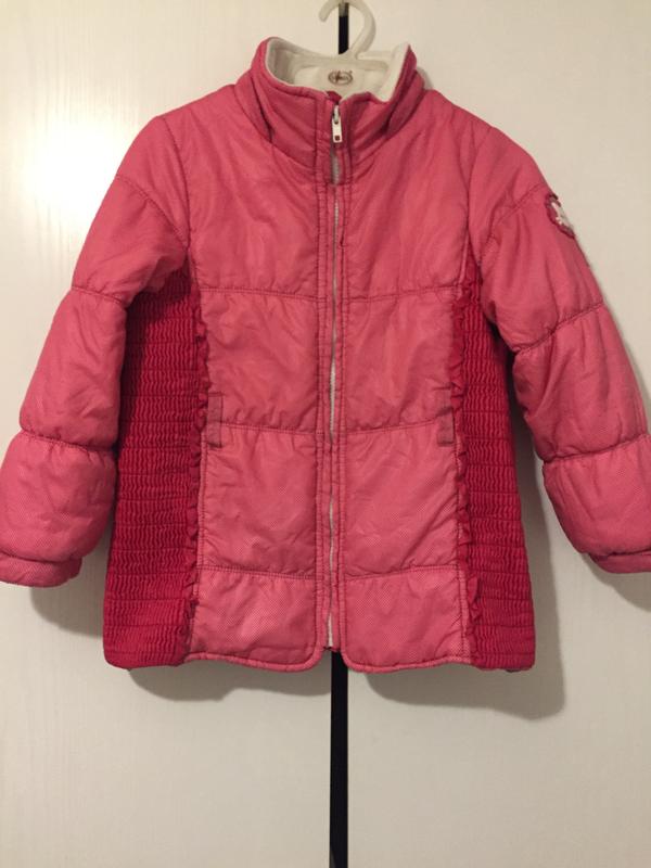 Курточка в отличном состоянии, без капюшона, на рост 122, внутри пришита резинка от задувания ветра. Цвет не розовый, а что-то среднее между малиновым и розовым.