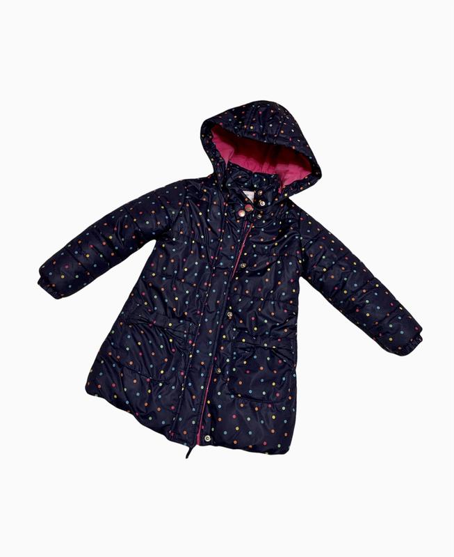 Зимняя теплая куртка в горошек, с капюшоном для девочки на рост 110 см. Плечи-30 см; Рукав-37 см; Длина- 53 см.