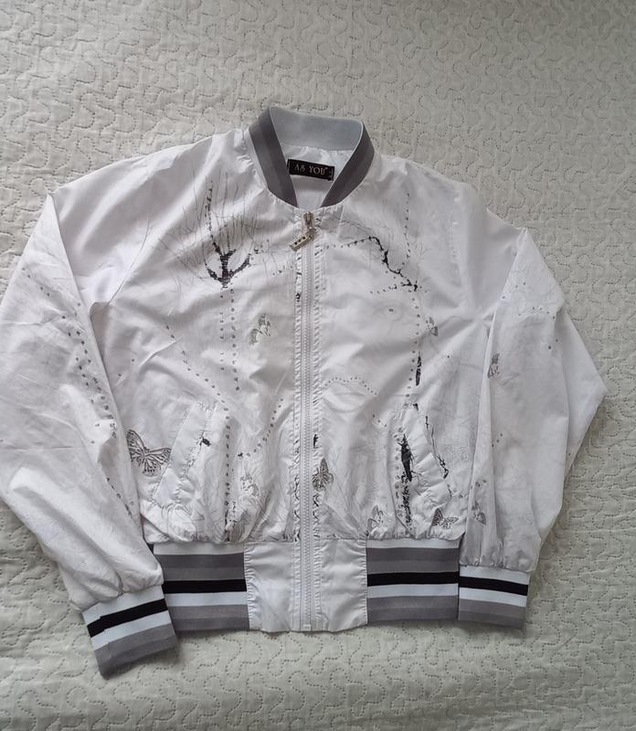 Вітрівка на підлітка -дівчинку з тоненькі поащівки..Підійде на теплу весняно- осінню пору, та на прохолодне літо. ПОГ- 48 см., довжина курточки- 54 см., довжина рукава(від плечового шва )- 58 см.