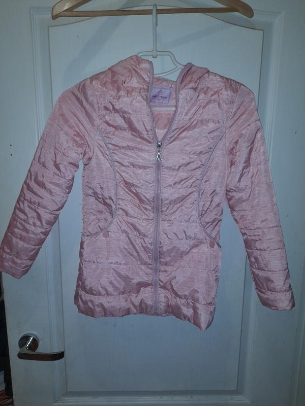 Лёгкая куртка для девочки розового цвета в красивую на змейке лёгкий синтепон,капюшон на 8-9 лет.Длина 59,Рукава 50см.ПО груди 38см.