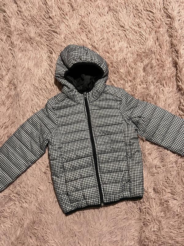 Куртка для дівчинки 4-5 років , принт гусяча лапка Є кишеньки , капюшон не відстібається Довжина 44 Напівобхват грудей 34 Довжина рукава від шиї 47