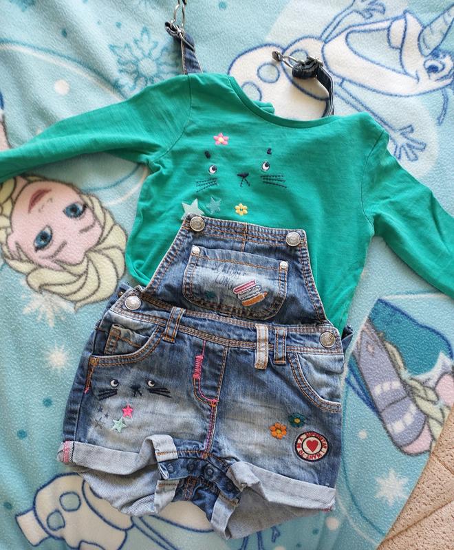 Джинсовый комбинезон шорты с футболкой на длинный рукав для девочки 12-18 месяцев, 86 см.