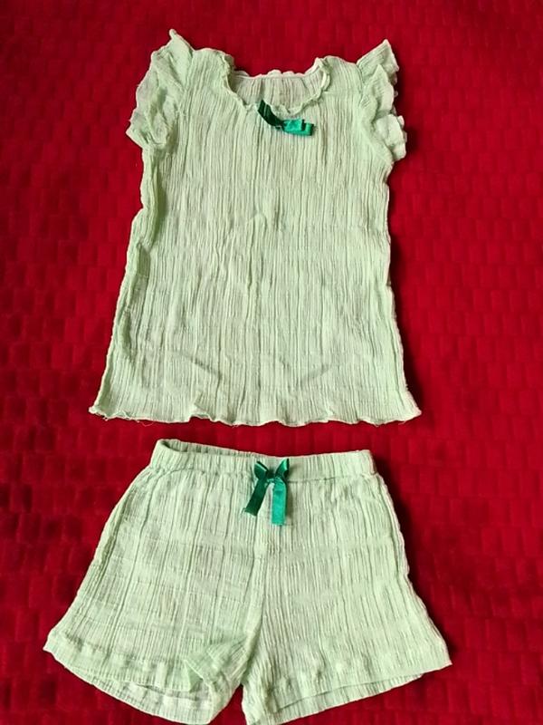 легесенка футболка и шортики из натуральной ткани с эластичными нитями свет бирюзового цвета на 3-5 рочков. Длина футболки 39 см., ширина плеч 20 см., длина шортиков 19 см., ширина в нерастянутом поясе 21 см.