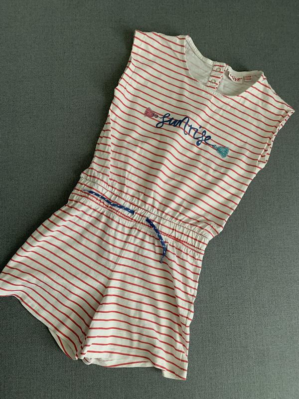 Летний хлопковый ромпер для девочки Alive Германия, р. 122/128 Материал тонкий легкий натуральный, приятный на ощупь, немного тянется поясок на резинке, шнурочек декоративный Состав на фото. Замеры: пог- 34 см поб 30 см + тянется полная длина от плеча - 68 см, длина шорт по боковому шву 26,5.