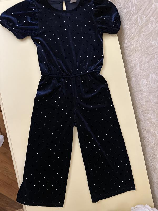 Длина 86см., брюки от пояса 64см. ПОГ 31см. На талии резинка, на перчатку также. Невероятно красивый. Ткань бархат, цвет темно синий. Одито один раз, состояние отлично! Размер указан 4-5 р., но можно и дольше носить, просто брюки будут кюлотами. Тканина тягнеться
