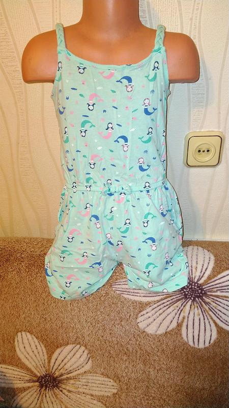 пише на ріст 110/116 по боках є кишеньки довжина з бретельками 54см 100% бавовна є нюанс вказала на останньому фото ( я думаю що вистірається )