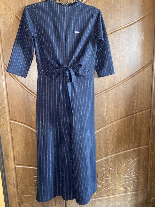 Комбинезон на рост 152, темно синего цвета с серебряными полосками, спереди на завязках. Если нужно, замеры скина