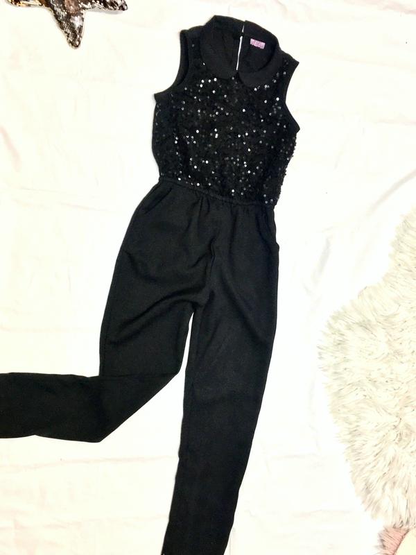 Черный блестящий комбинезон F&F на 8-9 лет.Застегивается на молнию и пуговицу на спинке.Сверху обшит паетками .По бокам карманы. Состояние отличное. Замеры: Длина (от плечевого шва )- 109 см; Полуобхват резинки на талии - 24 см (тянется до 33см); Полуобхват груди - 32,5 см; Длина штанины от пояса 76см. Длина по спинке от горловины до паха - 58,5 см