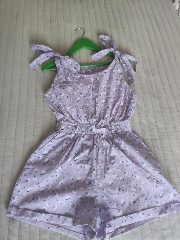 Комбинезон сиреневого цвета, принт цветочки, пояс на резинке, длина регулируется завязками, которые красиво смотрятся на плечах, как банты, длина по спинке 61, Полуобхват талии 27, Полуобхватгрэй 38,бедер 42,мевает два кармашка.