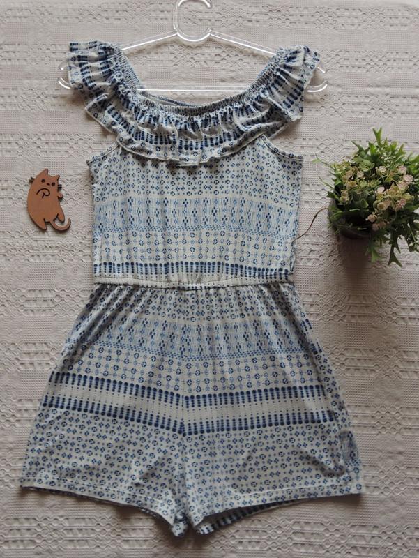 дуже гарний ромпер бренд FF підмишки 40 54 талія резинка 31-48 бедра 48 66 довжина Макс 71 см довжина крайнім точкам за етикетку 11 12 років у складі 96% віскози
