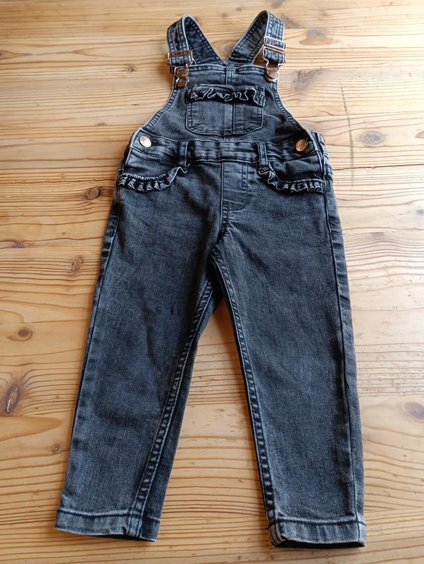 Черный джинсовый комбинезон для девочки 1.5-2 лет на рост 92 см.Замвры:полуобхват талии 27 см, длина брюк 47 см, шаговый шов 30 см.В подарок-желтый велюровый свитерик
