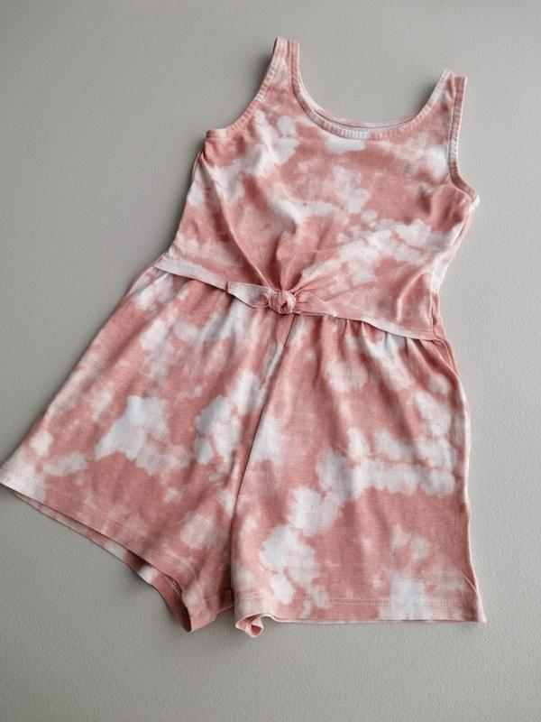 Класний стильний літній комбінезон, ромпер Tu на дівчинку. Зріст вказаний 110,на дитину 5 років. В дуже хорошому стані, тільки на правій штанині плямка(крайні фото) . Тканина трикотаж, бавовна 100%. Довжина 53,до проміжності 55,під руками 29,в поясі 27,бедра 36.