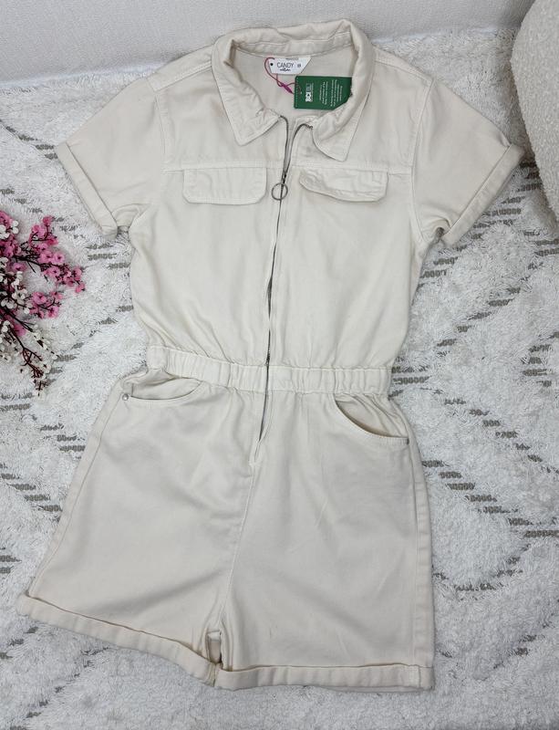 Новый джинсовый комбинезон кремового цвета. По бирке 13 лет. Есть пара точек последние 2 фото, при стирке отойдутmerю. В цене учтены. Длина 76, ширина под руками 40.