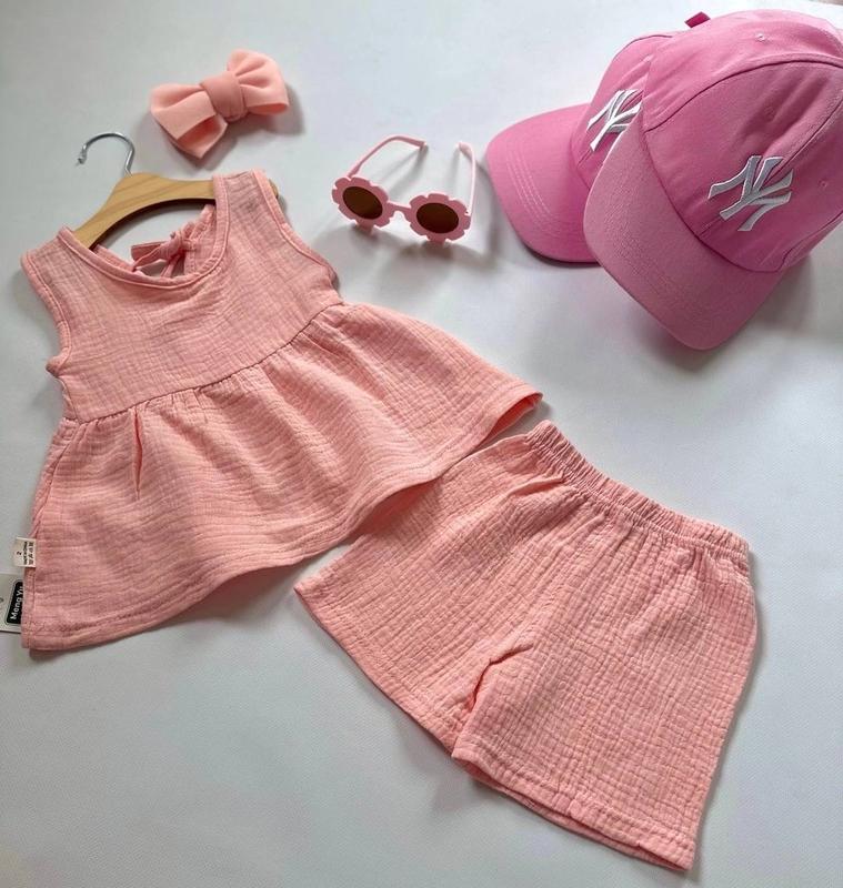 Літній легесенький костюмчик Тканина - муслін На майці є шнурівка на спинці для зручності Пояс шортиків на резинці Розмір 80 90 100 110