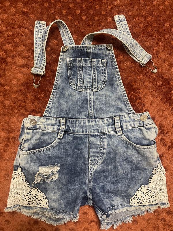 Джинсовий комбінезон на дівчинку 6 років, зріст 116 см Напівобхват талії 31 см Довжина від груді до низу ( без лямок) 42 см Довжина лямок 37 см Стан ідеальний Прикрашений мереживом