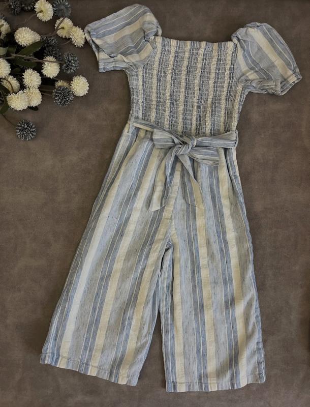 Стильний комбез у відмінному стані на 4-5 років, має підкладку, на грудях і спинці прошито резинками. Довжина 71 см