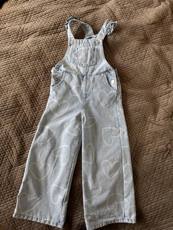 Джинсовий комбінезон для дівчинки з милими сердечками Розмір 116 В дуже гарному стані На одній штанині малесенька плямка (є на фото) Штанина 65 Крок 46 ПО стегна 34