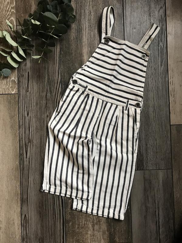 Продам стильный комбинезончик в полоску, штанишки идут как кюлоты, б/у в отличном состоянии, без дефектов. Фирма next, возраст указан 5 лет{110см}. В составе 54% лёна и 45% хлопка. Замеры: пояс{полуобхват}-29см, общая длина-76-78см{в зависимости от длины лямок}, посадка-18см, шаг-25,5см.