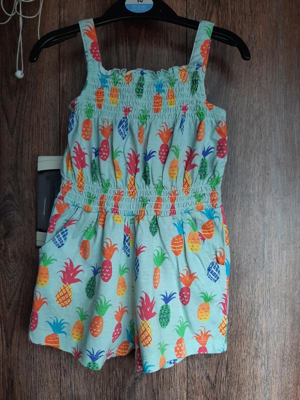 Яркий фруктовый комбинезончик с принтом ананасики.Ткань мягкая и дышащая. В состоянии новой вещи без следов носки и дефектов.