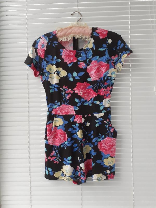 Ромпер в цветочный принтер, состояние нового. Длина 68 ПОГ 37 длина до пояса 38 пояс 32 ПОБ 46 плечи 32 Хорошо тянется, по бокам карманы, сзади змейка длиной до линии бедра.
