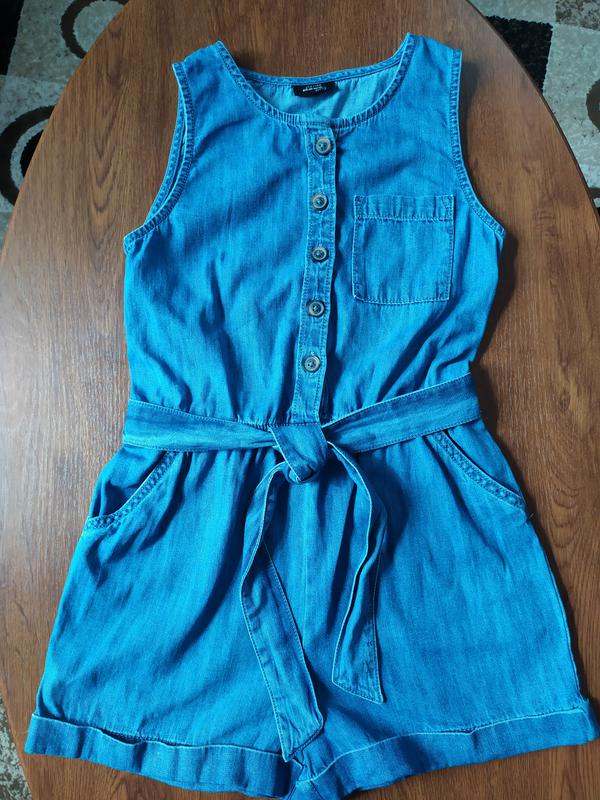 Красивый ромпер. В отличном состоянии! Без нюансов! Джинс мягкий, не твердый. Размер указан 134/140. Смотрите замеры: длина общая 65см, до резинки (талии) 36см, от резинки 29см, талия (резинка) 30см, тянется до 35см. ПОГ 36см, ПОБ 46см. Шаговый шов 5см. Цвет ближе к последнему фото.