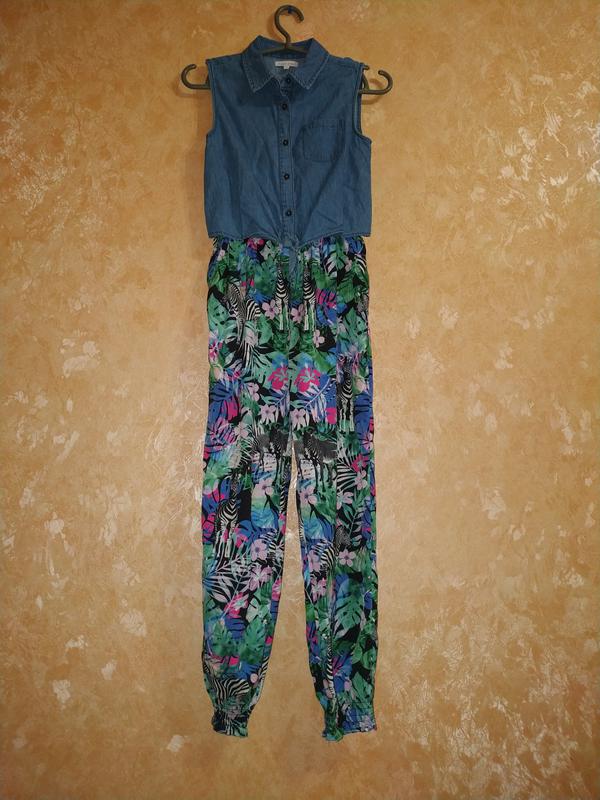 Верхняя часть выполнена из тонкой джинсы, а нижняя из тонкой, яркой, принтованной ткани. Состояние новой вещи